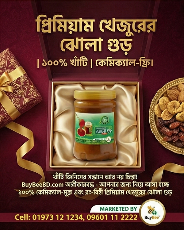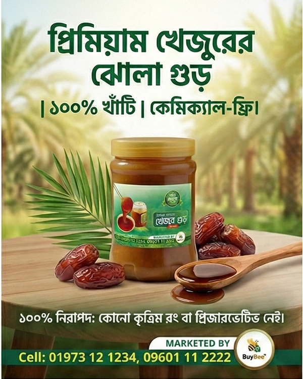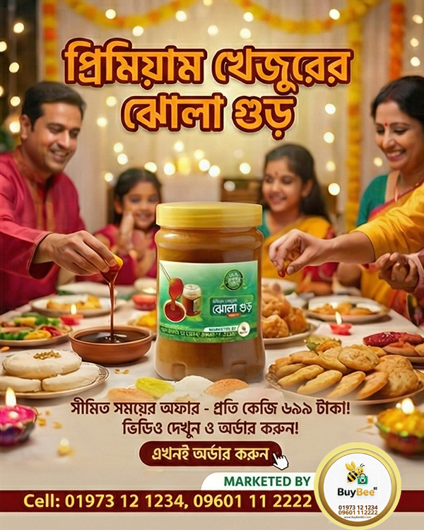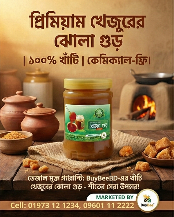 শীতের আসল স্বাদ এখন BuyBee BD-তে! আমাদের প্রিমিয়াম খেজুরের ঝোলা গুড় — ১০০% খাঁটি, নকলমুক্ত, কেমিক্যাল-ফ্রি এবং নির্ভরযোগ্য কৃষকদের কাছ থেকে সরাসরি সংগ্রহ করা। পিঠা, পায়েশ ও সকালের নাস্তায় ব্যবহার করুন নিখুঁত স্বাদ পেতে। খাঁটি না হলে সম্পূর্ণ টাকা ফেরত!